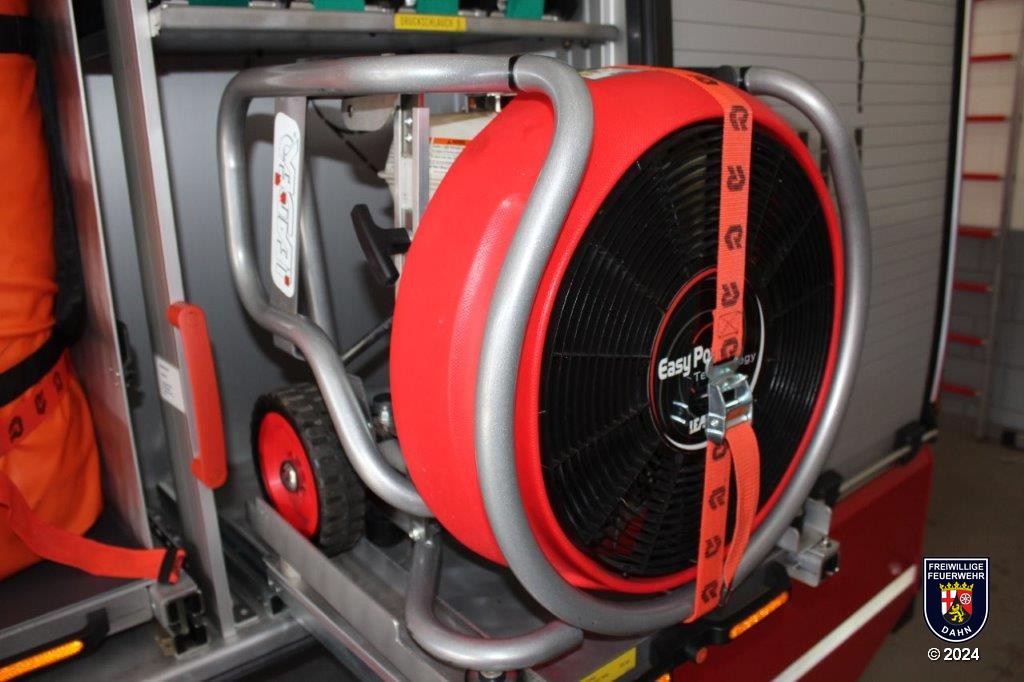 Auf dem RW ist der "ES230 Easy Pow´Air" der Firma Leader verlastet. Dieser Lüfter wird elektrisch betrieben und hat im Freien eine Luftleistung von 48.000 m³/h. Er ist 39,3 kg schwer und kann aufgrund seiner handlichen Ausführung bequem von einer Person zum Einsatzort verbracht und in Betrieb genommen werden.