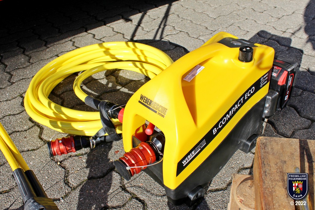 Zusätzlich wurde ein tragbares, akkubetriebenes Hydraulikaggregat Weber B-Compact Eco inkl. eines 10m-Hydraulikschlauches beschafft, welches von einem Feuerwehrangehörigen in kürzester Zeit an ein Unfallfahrzeug getragen und in Betrieb genommen werden kann. Das Aggregat kann wahlweise mit einem oder zwei Akkus, aber auch mit einem Netzanschluss betrieben werden. Leistungseinbußen im Vergleich zum o.g. Aggregat gibt es nicht.