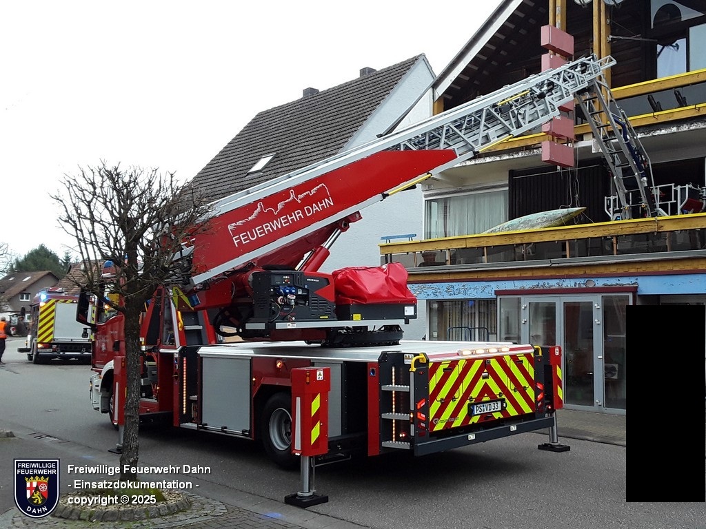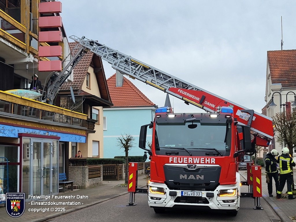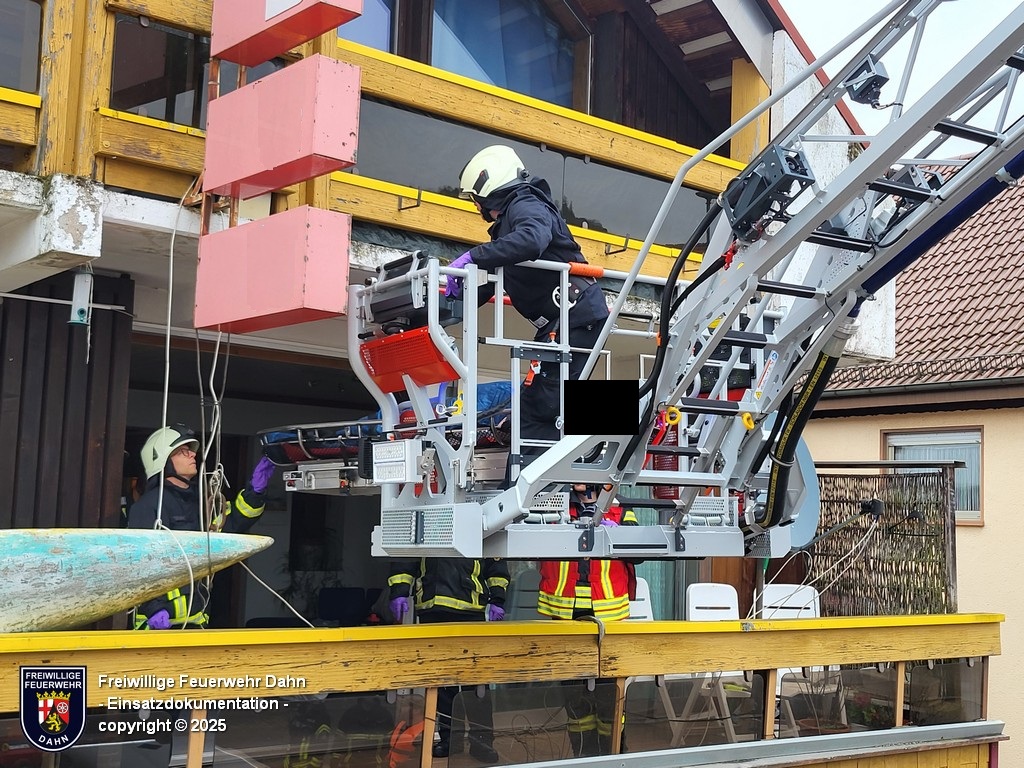 Am Montagmorgen wurde die Feuerwehr zur Tragehilfe des Rettungsdienstes bei einem Krankentransport angefordert. Aufgrund der baulichen Gegebenheiten war nur ein liegender Transport über den Balkon aus dem 1. OG möglich. Mit der DLK wurde die Person auf dem Balkon aufgenommen und zu Boden transportiert.