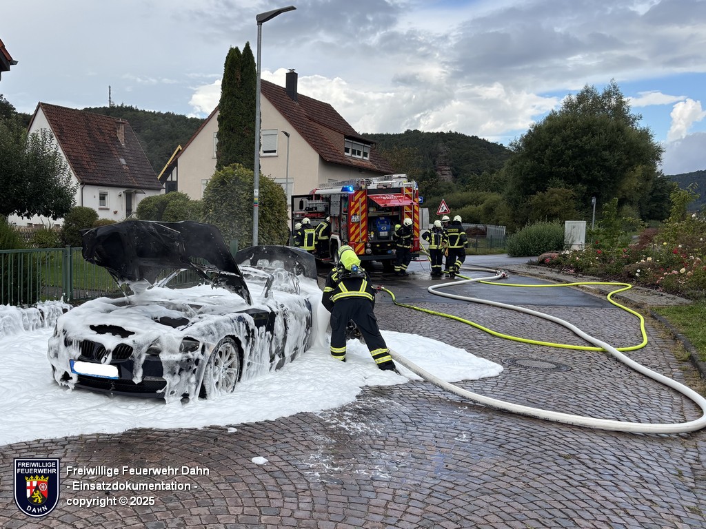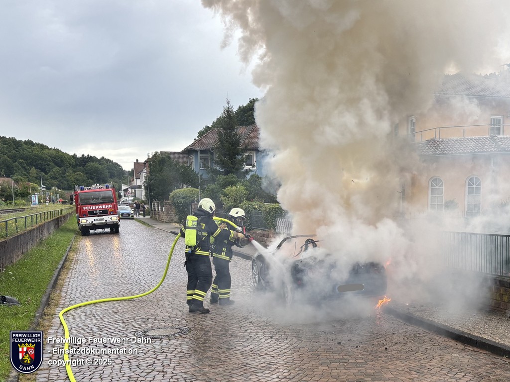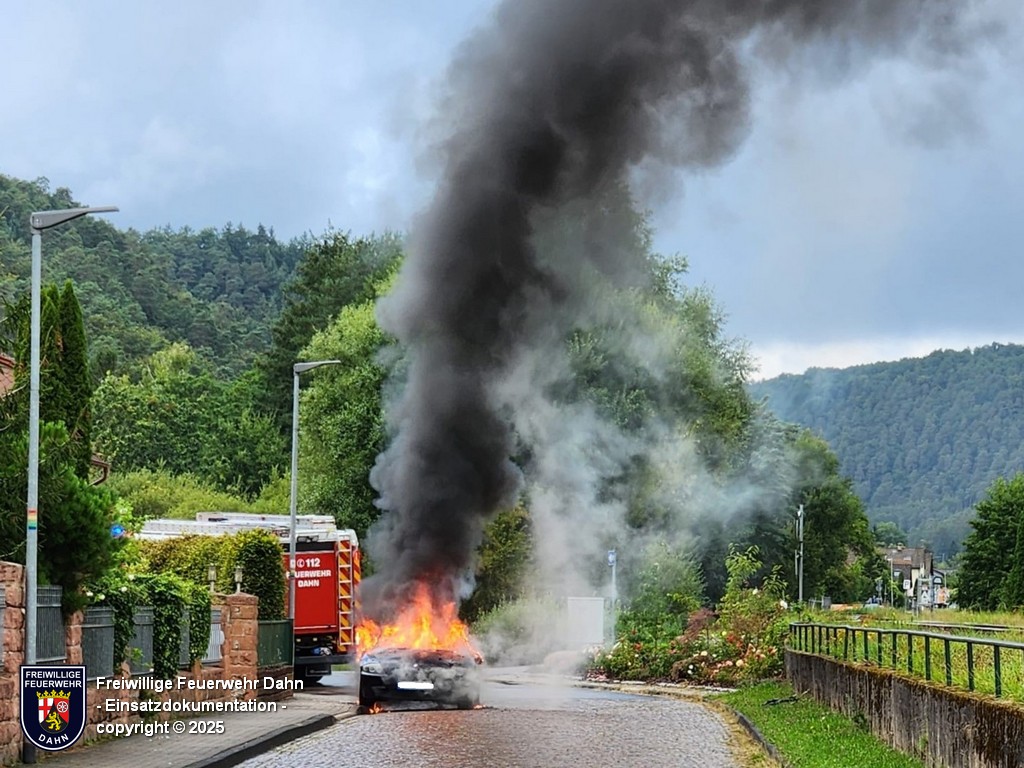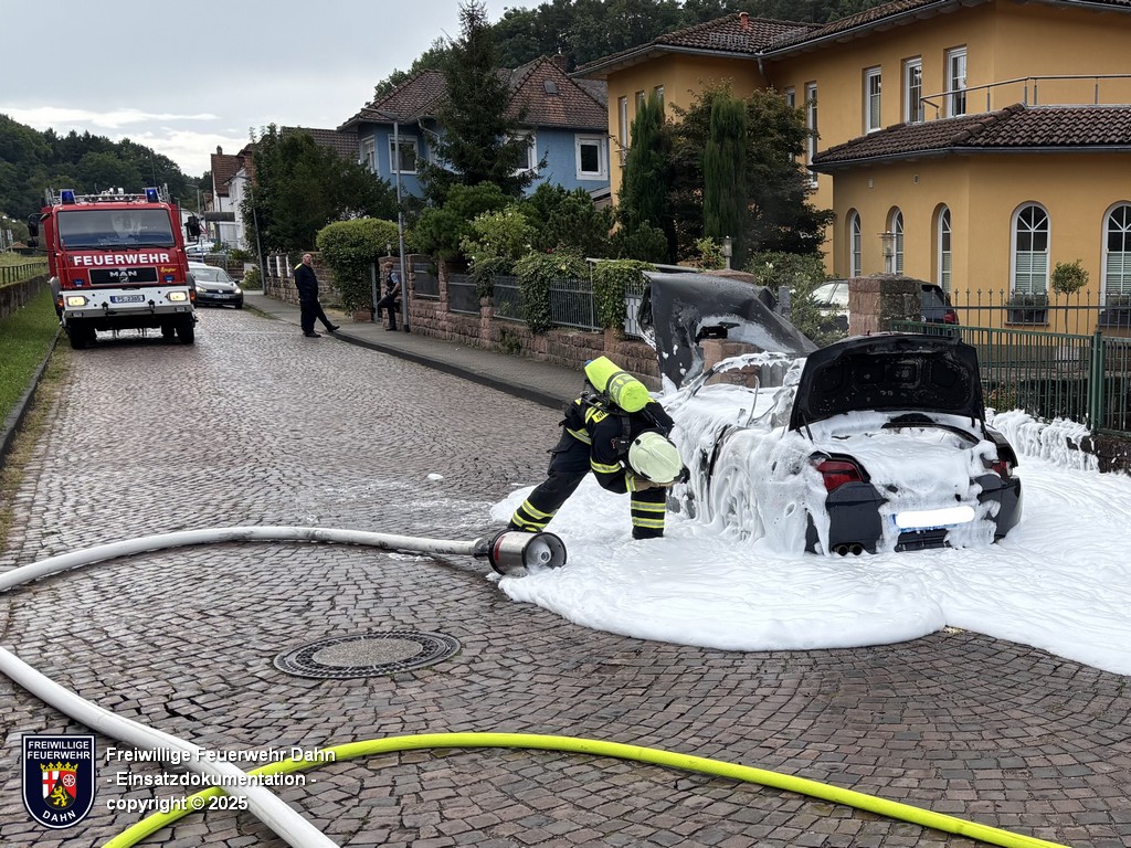 In der Ludwigstraße in Dahn geriet am Freitagvormittag ein Fahrzeug in Brand. Beim Eintreffen der Einsatzkräfte stand dieses bereits in Vollbrand. Der Angriffstrupp löschte das Feuer unter schwerem Atemschutz mit dem Schnellangriff und deckte es mit einem Schaumteppich ab. Aufgrund des verunreinigten Löschwassers wurden die Abwasserwerke der VG verständigt.