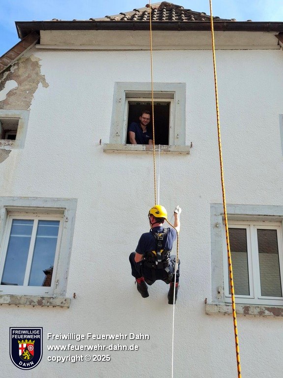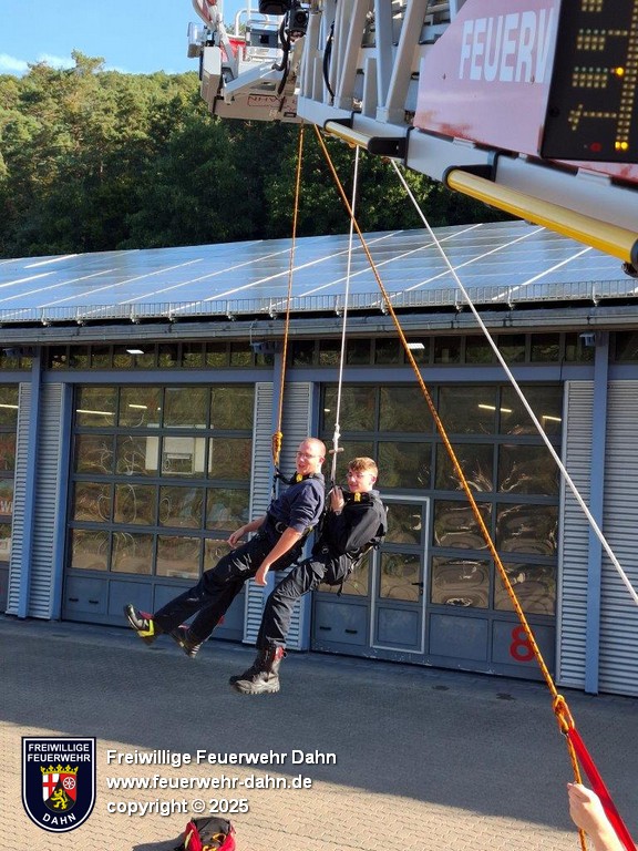 Am darauffolgenden Freitag, den 05.09.2025 wurde die Rettung aus unwegsamem Gelände trainiert. „Unterstützung Rettungsdienst Gelände“ ist ein Einsatzstichwort, zu dem die Feuerwehr Dahn häufig alarmiert wird, insbesondere in den Sommermonaten. Aufgrund der Topografie des Pfälzerwaldes ist das Gelände meist unwegsam, weshalb spezielle Ausrüstung zum Einsatz kommen muss. So ist auf dem Rüstwagen der Dahner Einheit ein Auf- und Abseilgerät des Typs Rollgliss verlastet. Zudem wird ein Gerätesatz Absturzsicherung (GS Absturz) vorgehalten, der immer dann zum Einsatz kommt, wenn Feuerwehrkräfte in absturzgefährdeten Bereichen arbeiten müssen.