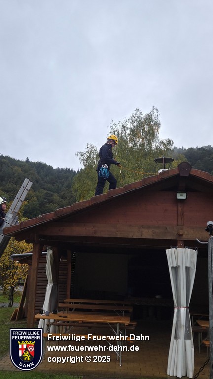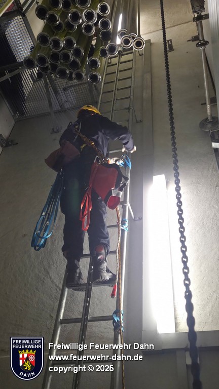 Ob bei Nachlöscharbeiten auf Dächern, bei der Personenrettung aus steilem Gelände oder beim Vorstieg auf einen Kranausleger – bei vielen Feuerwehreinsätzen kann ein freier Fall nicht ausgeschlossen werden, was eine Sicherung gegen Absturz notwendig macht. Dafür steht auf dem Rüstwagen (RW) der Dahner Einheit ein Gerätesatz Absturzsicherung zur Verfügung, dessen Nutzung spezielles Fachwissen und eine entsprechende Ausbildung erfordert.