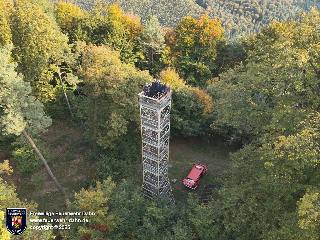 Zum Abschluss des Lehrgangs musste eine praktische Prüfung gemeistert werden: Der Eybergturm musste im gesicherten Vorstieg vollständig erklommen und auf die Aussichtsplattform übergestiegen werden. Trotz der herausfordernden Aufgabe bestand für die Teilnehmenden natürlich ausreichend Gelegenheit, die herrliche Aussicht ins Dahner Felsenland zu genießen. Wir bedanken uns bei den vier neu ausgebildeten Kameraden für ihr herausragendes Engagement in der Freizeit und gratulieren zum erfolgreichen Bestehen!