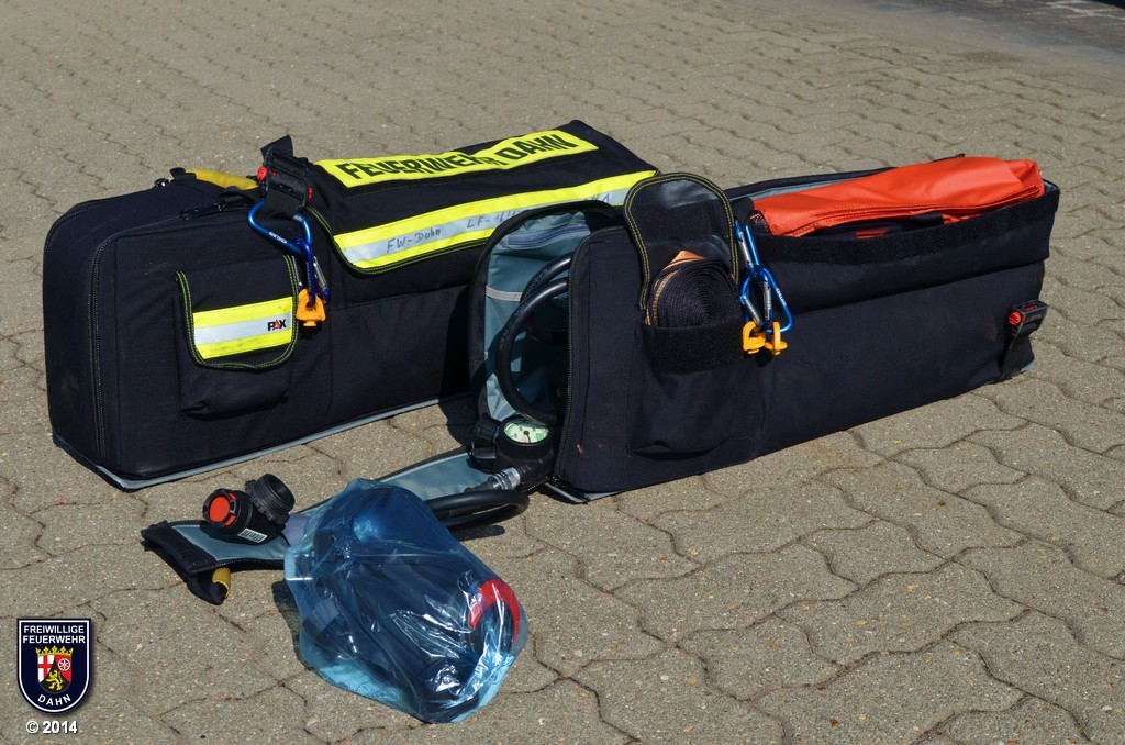 In kleineren Fächern an der Seite der Tasche sind drei Türkeile, eine Bandschlinge mit Karabinerhaken sowie zwei Sicherungsstifte für den Totmannwarner (um diesen zu deaktivieren wenn ein Verunfallter aufgefunden wurde) vorhanden. Jeweils eine Notfalltasche sind auf dem HLF 10 und TLF 16/45-W verlastet.