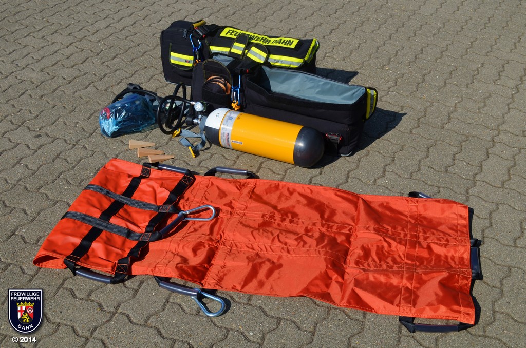 Im oberen Fach wird ein Rettungstuch mitgeführt, mit dem der Atemschutzgeräteträger gerettet werden kann, wenn er bei seiner Rettung z.B. durch Verletzung seiner Beine nicht mehr mithelfen kann.