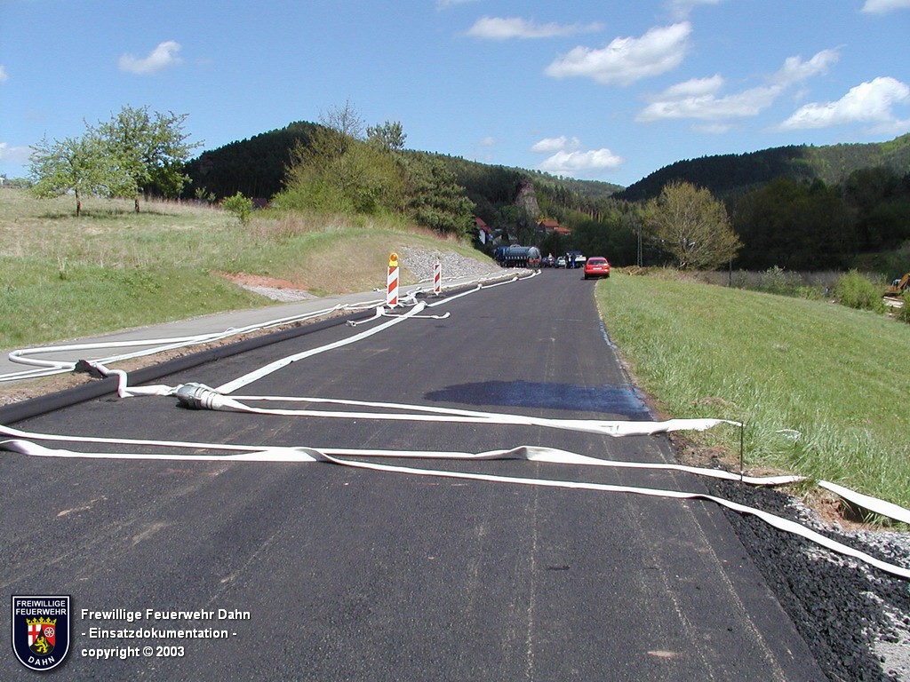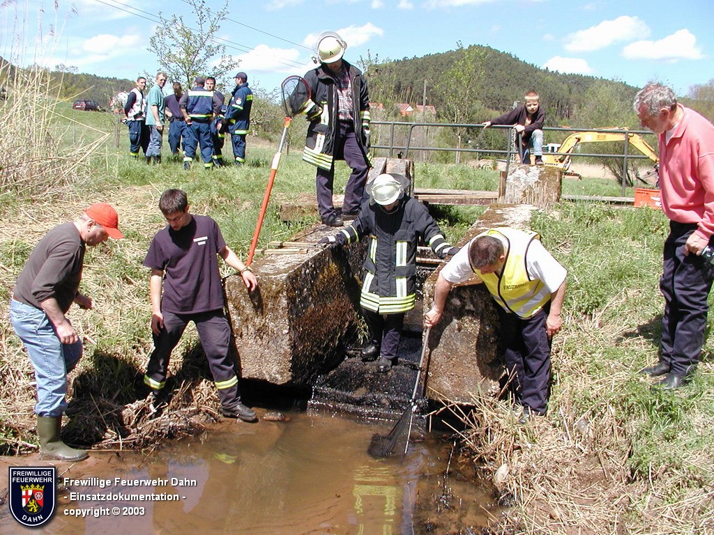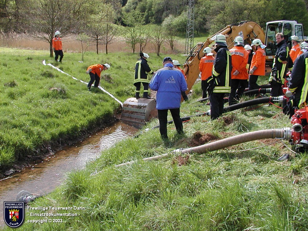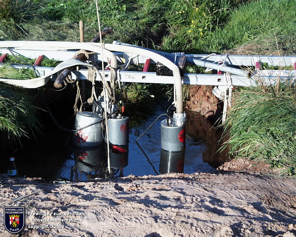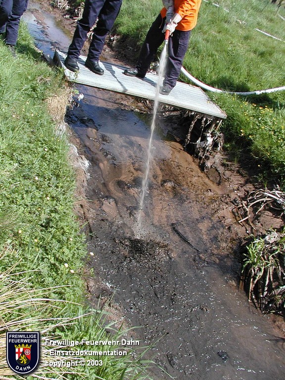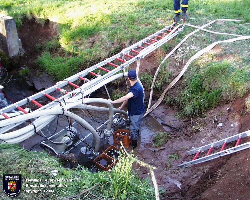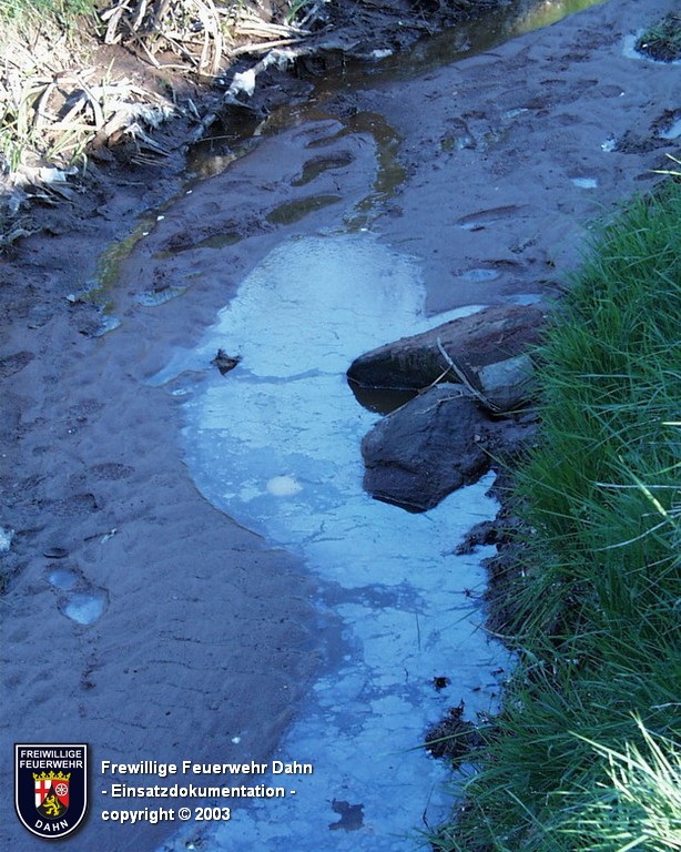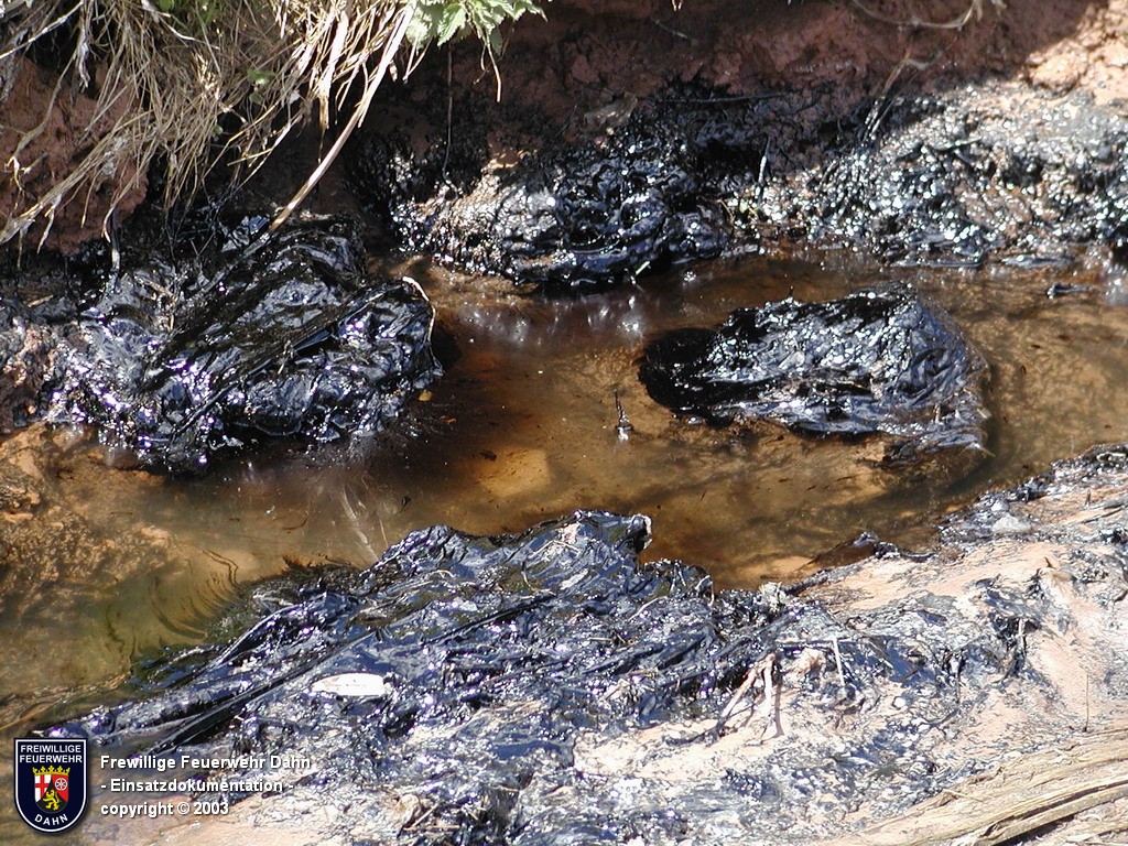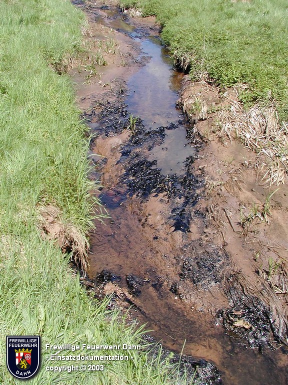 Die aufgrund des Alarmstichwortes „Ölspur“ ausgerückten Kräfte fanden an einer Straßenbaustelle einen Anhänger mit Estol-Haftkleber für Bitumen vor, an dem Unbekannt ein Ventil geöffnet hatten. Mehrere tausend Liter der klebrigen Flüssigkeit gelangten über die Straßenentwässerung in den Eibach und über diesen in die Wieslauter, wo sie ein Fischsterben verursachten. Der Bachlauf wurde daraufhin oberhalb der Eintrittsstelle aufgestaut und anfänglich über TS 8/8, später über die Hannibal-Pumpen des THW auf einer Länge von ca. 500 Metern über einen Bypass an der am stärksten verschmutzten Gewässerstelle vorbei umgeleitet. Im trocken gelegten Bachbett wurde der abgesetzte Haftkleber von einer Spezialfirma abgesaugt und entsorgt. Bei diesem Einsatz mussten etliche Werkzeuge, Einsatzkleidungen und Gerätschaften wegen ihrer starken Verschmutzung entsorgt werden.