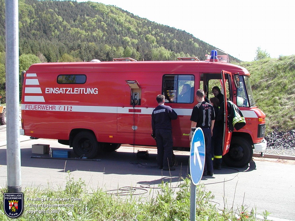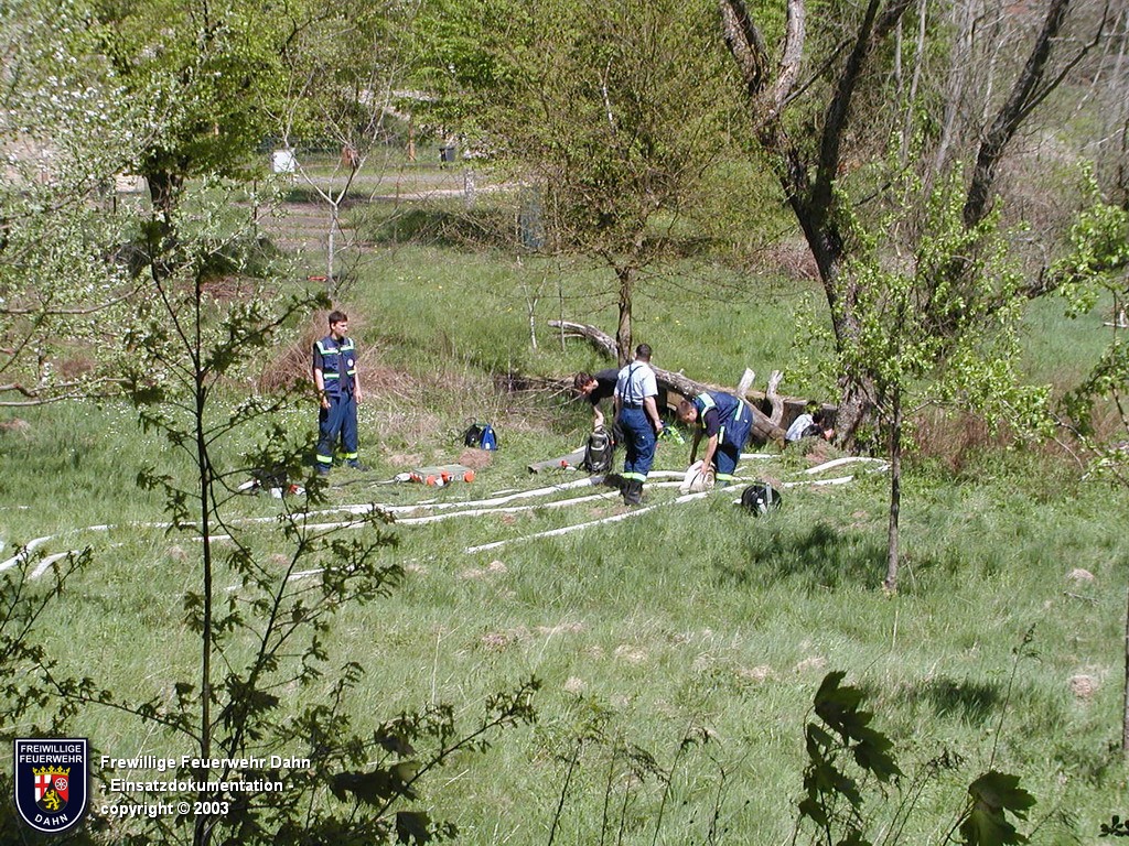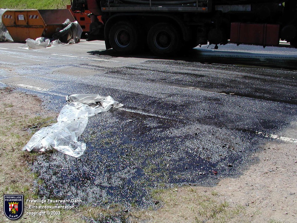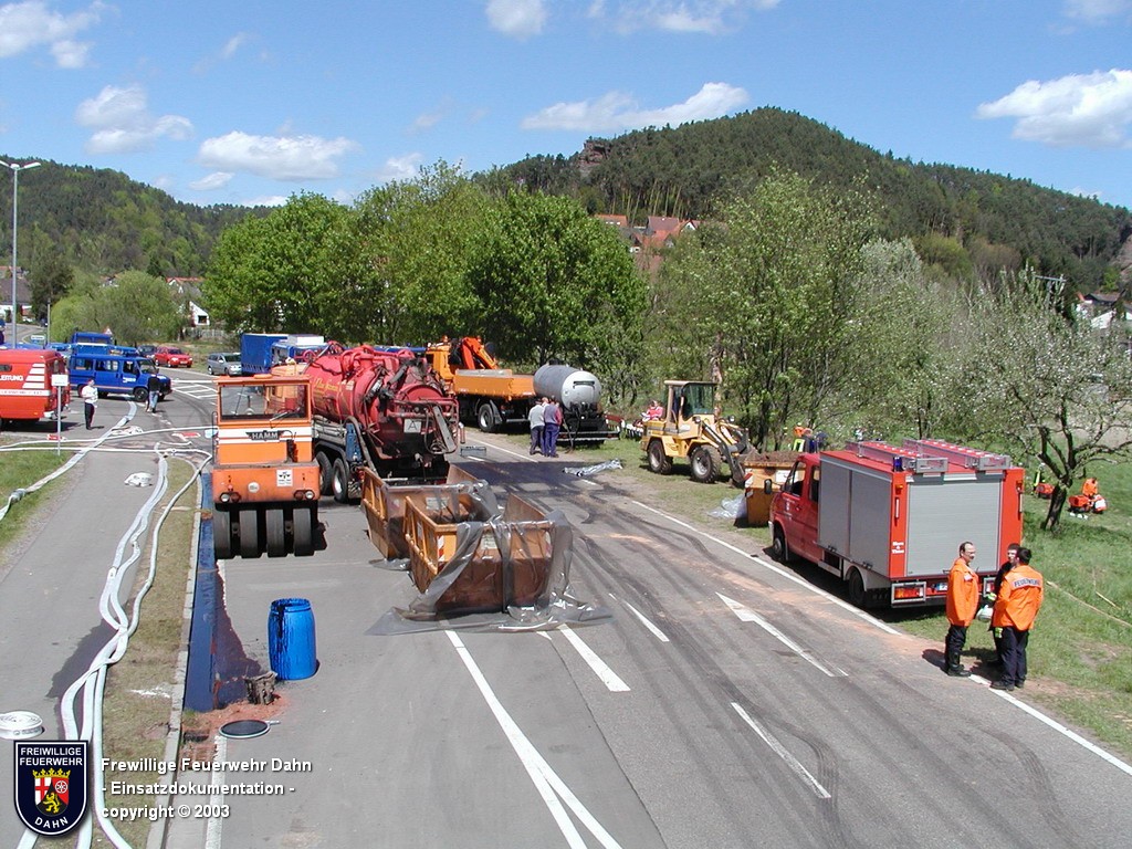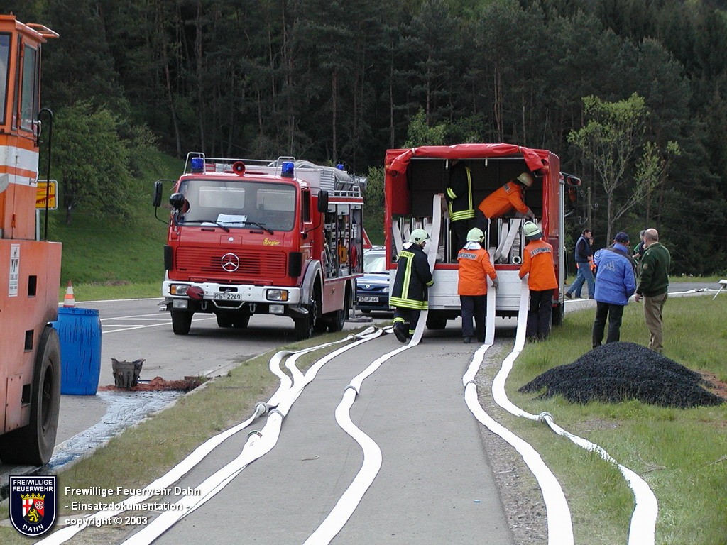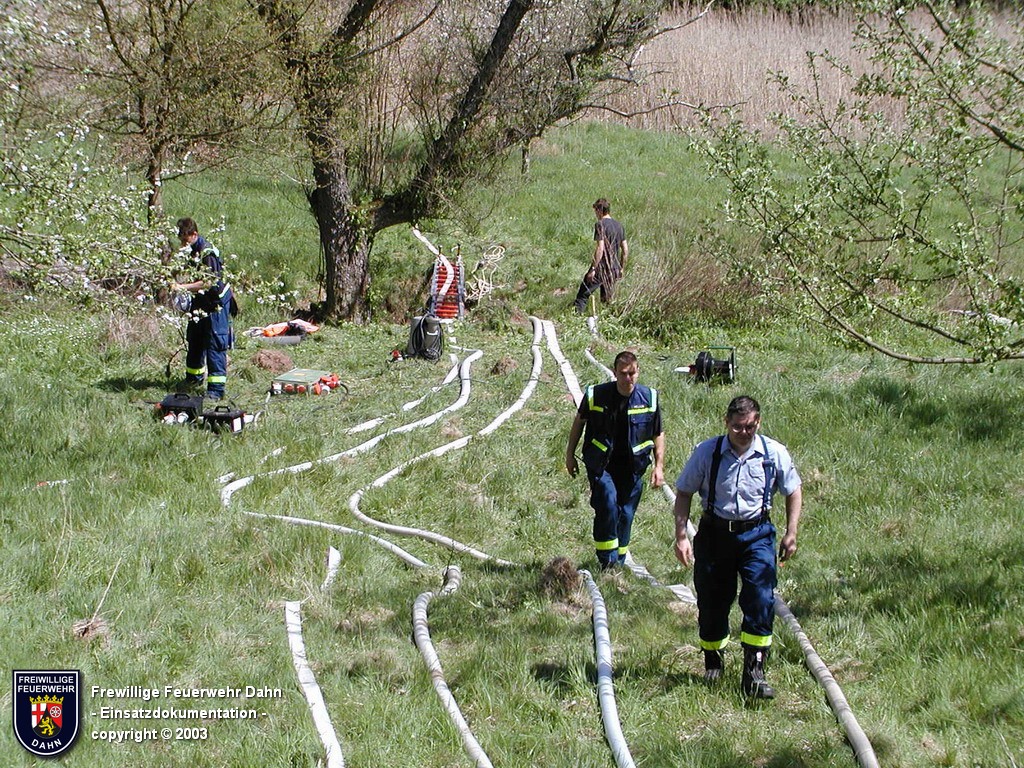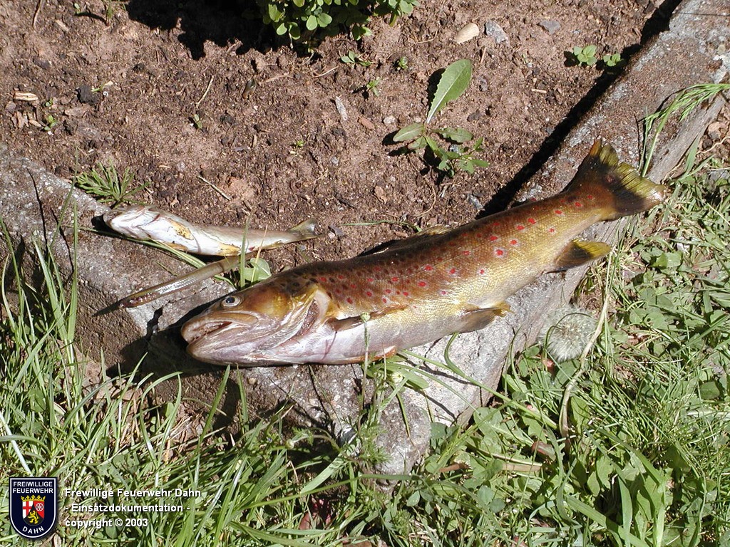 Die aufgrund des Alarmstichwortes „Ölspur“ ausgerückten Kräfte fanden an einer Straßenbaustelle einen Anhänger mit Estol-Haftkleber für Bitumen vor, an dem Unbekannt ein Ventil geöffnet hatten. Mehrere tausend Liter der klebrigen Flüssigkeit gelangten über die Straßenentwässerung in den Eibach und über diesen in die Wieslauter, wo sie ein Fischsterben verursachten. Der Bachlauf wurde daraufhin oberhalb der Eintrittsstelle aufgestaut und anfänglich über TS 8/8, später über die Hannibal-Pumpen des THW auf einer Länge von ca. 500 Metern über einen Bypass an der am stärksten verschmutzten Gewässerstelle vorbei umgeleitet. Im trocken gelegten Bachbett wurde der abgesetzte Haftkleber von einer Spezialfirma abgesaugt und entsorgt. Bei diesem Einsatz mussten etliche Werkzeuge, Einsatzkleidungen und Gerätschaften wegen ihrer starken Verschmutzung entsorgt werden.