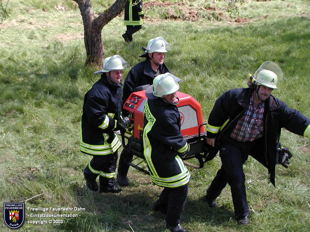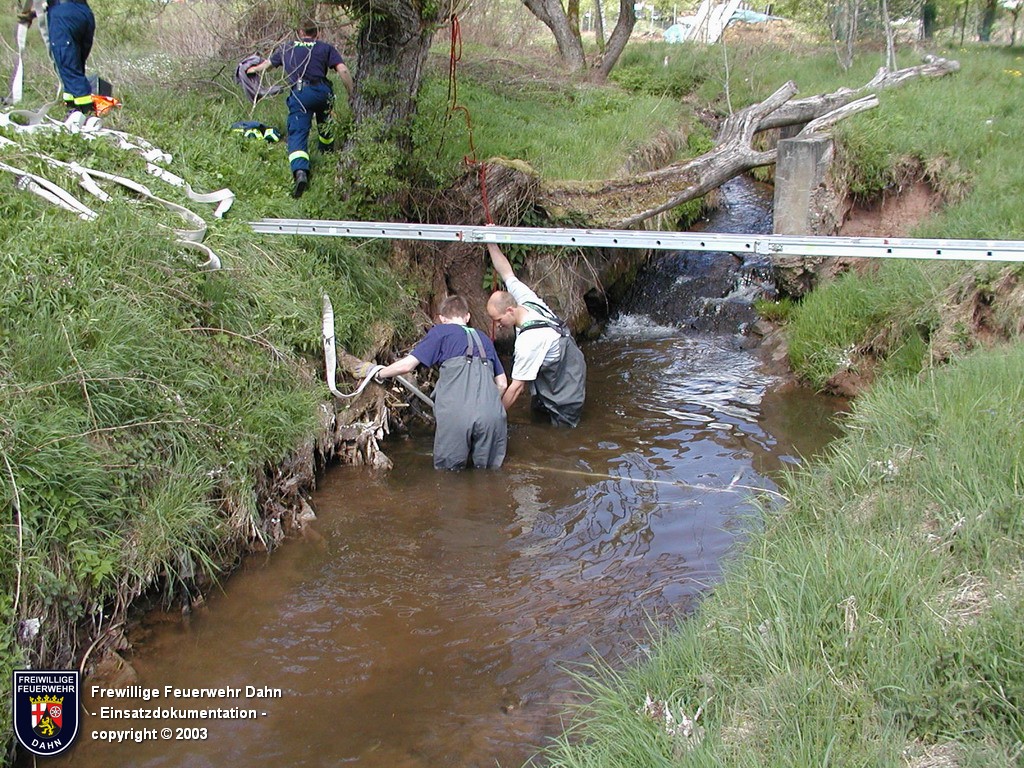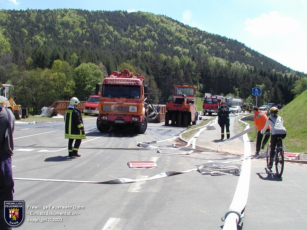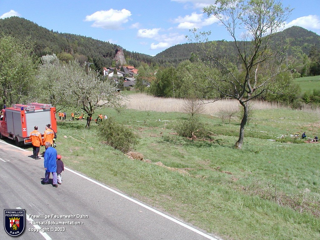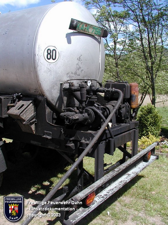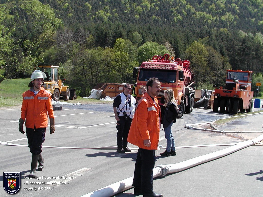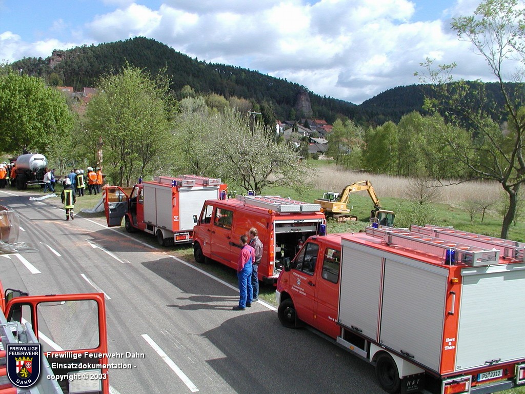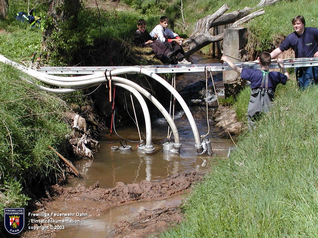Die aufgrund des Alarmstichwortes „Ölspur“ ausgerückten Kräfte fanden an einer Straßenbaustelle einen Anhänger mit Estol-Haftkleber für Bitumen vor, an dem Unbekannt ein Ventil geöffnet hatten. Mehrere tausend Liter der klebrigen Flüssigkeit gelangten über die Straßenentwässerung in den Eibach und über diesen in die Wieslauter, wo sie ein Fischsterben verursachten. Der Bachlauf wurde daraufhin oberhalb der Eintrittsstelle aufgestaut und anfänglich über TS 8/8, später über die Hannibal-Pumpen des THW auf einer Länge von ca. 500 Metern über einen Bypass an der am stärksten verschmutzten Gewässerstelle vorbei umgeleitet. Im trocken gelegten Bachbett wurde der abgesetzte Haftkleber von einer Spezialfirma abgesaugt und entsorgt. Bei diesem Einsatz mussten etliche Werkzeuge, Einsatzkleidungen und Gerätschaften wegen ihrer starken Verschmutzung entsorgt werden.