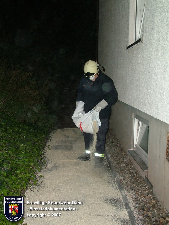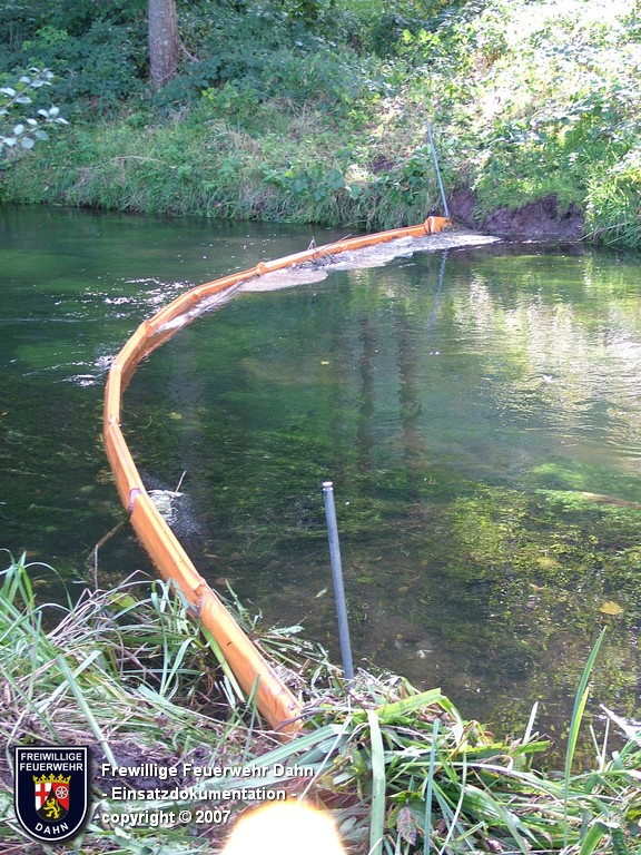 Während des im Feuerwehrhaus Dahn stattfindenden Dia-Vortrages von Mitsch Schreiner über sein Hilfsprojekt auf den Philippinen schlugen die Meldeempfänger der Angehörigen der Feuerwehr Dahn Alarm. Beim Befüllen eines Heizöltanks flossen aus bisher unbekannter Ursache über die Entlüftungseinrichtung auf dem Dach überm 2. OG eines Wohnhauses mehrere hundert Liter Heizöl auf das Dach und von dort über die Oberflächenentwässerung in die Kanalisation. Bei Ankunft der ersten Kräfte an der Einsatzstelle stand Öl sowohl im Tankraum als auch in der Dachrinne sowie auf dem Erdboden unterhalb der Dachrinne. Die Kontrolle der Kanalisation ergab, dass das Öl auch dort schon angelangt war.