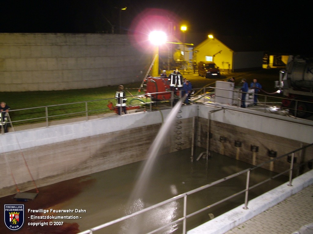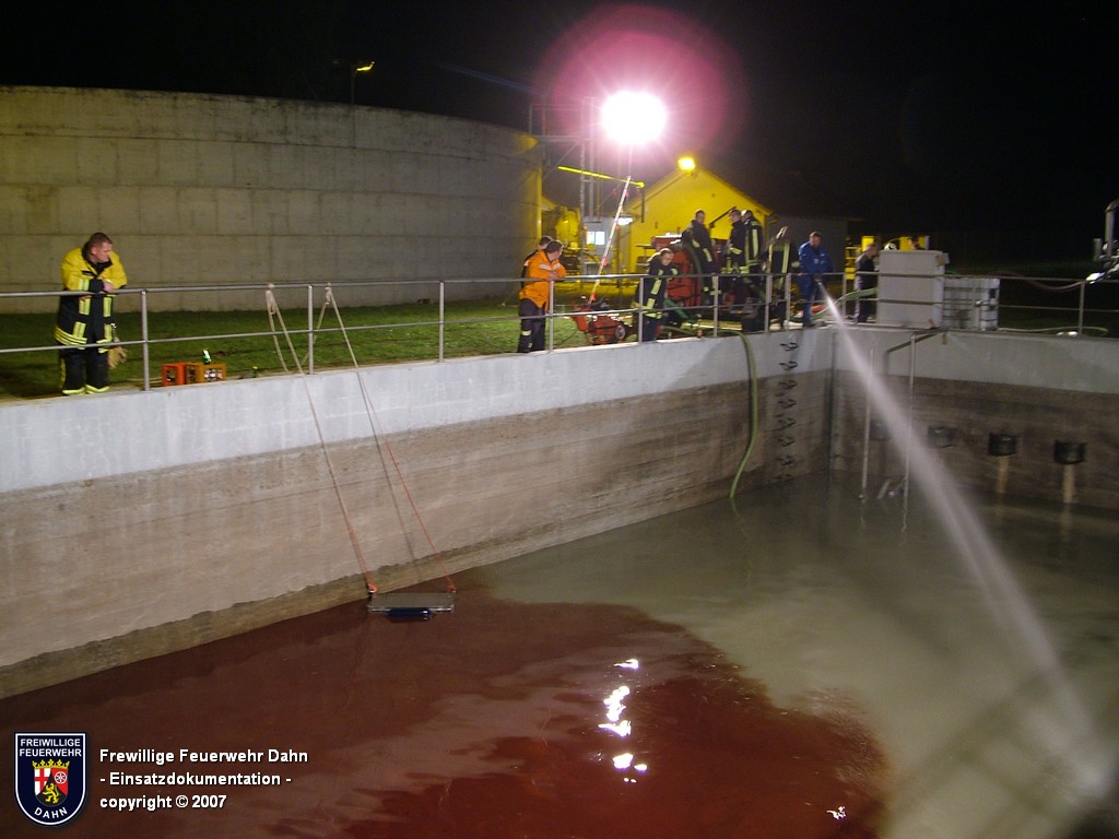 Durch den verständigten Bereitschaftsdienst der Klärwerke konnte in letzter Minute das in der zwei Kilometer entfernten Kläranlage bereits ankommende Öl-Abwasser-Gemisch in ein Auffangbecken umgeleitet werden. Die Einsatzkräfte der Feuerwehr Dahn errichteten mehrere Ölsperren in der Kanalisation, im Zulauf zur Kläranlage sowie auf der Wieslauter. Im Tankraum des betroffenen Gebäudes wurde das Öl unter Atemschutz mittels Bindemittel gebunden. Unterstützung erhielten die Dahner Floriansjünger von ihren Kameraden aus Erfweiler, dem Gefahrstoffzug des Landkreises Südwestpfalz, sowie der Feuerwehr Landau, die mit einem Ölsanimat anrückte. Hiermit wurde das auf dem Abwasser im Auffangbecken der Kläranlage Dahn schwimmende Öl abgesaugt und vom Wasser getrennt.