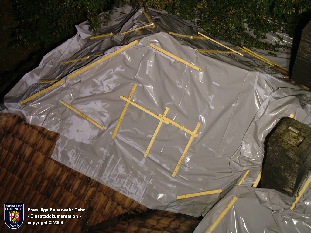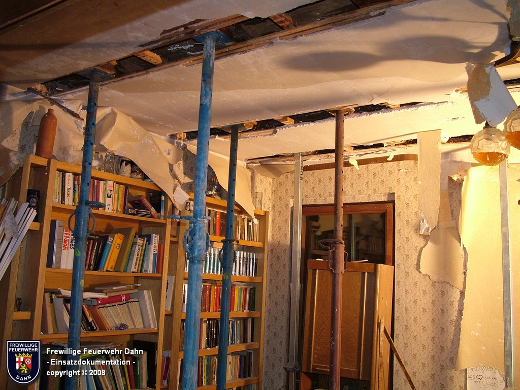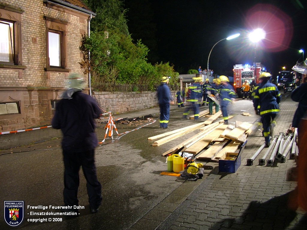 Die Stabilisierung des beschädigten Hauses wurde durch die THW Ortsverbände Hauenstein und Landau in mühevoller Handarbeit in den folgenden Stunden professionell erledigt. In Zusammenarbeit von THW und Feuerwehr wurden am Ende der Löscharbeiten die beschädigten Dachbereiche provisorisch mit Folie abgedichtet, um weitere Schäden durch eventuelle Regenfälle zu verhindern.
