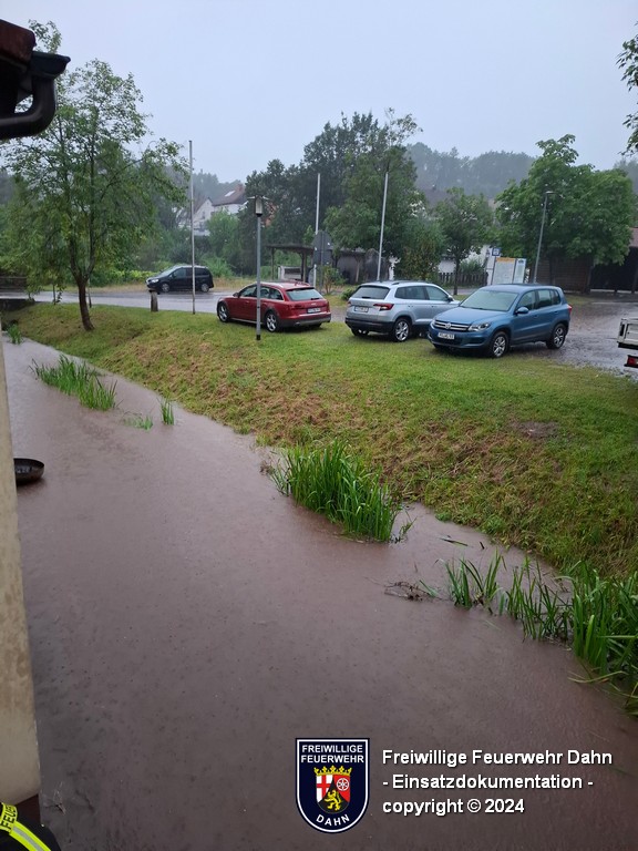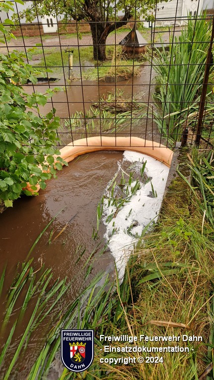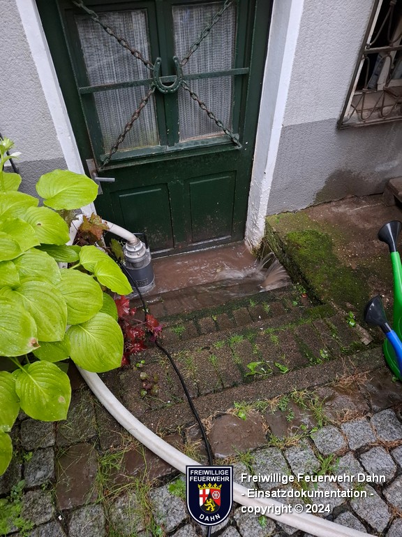 Nahe des Feuerwehrhauses in Erfweiler trat infolge starker Regenfälle die Eybach über die Ufer. Hierbei wurde der Keller eines Wohnhauses überflutet. Mit einer Tauchpumpe wurde das Wasser entfernt. Zeitgleich wurden aufgrund eines leichten Ölfilmes eines Ölsperre in der Eybach installiert und die Klärwerke informiert.