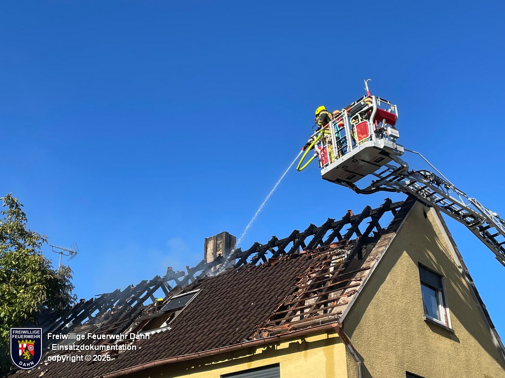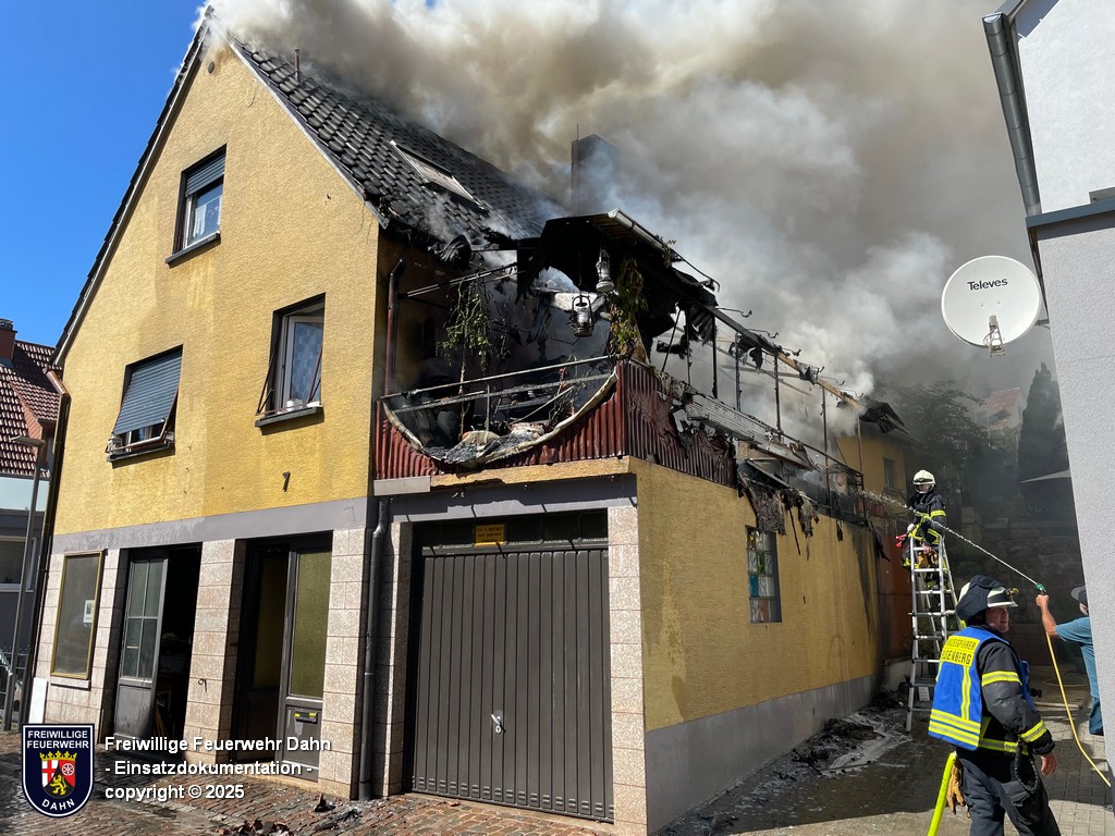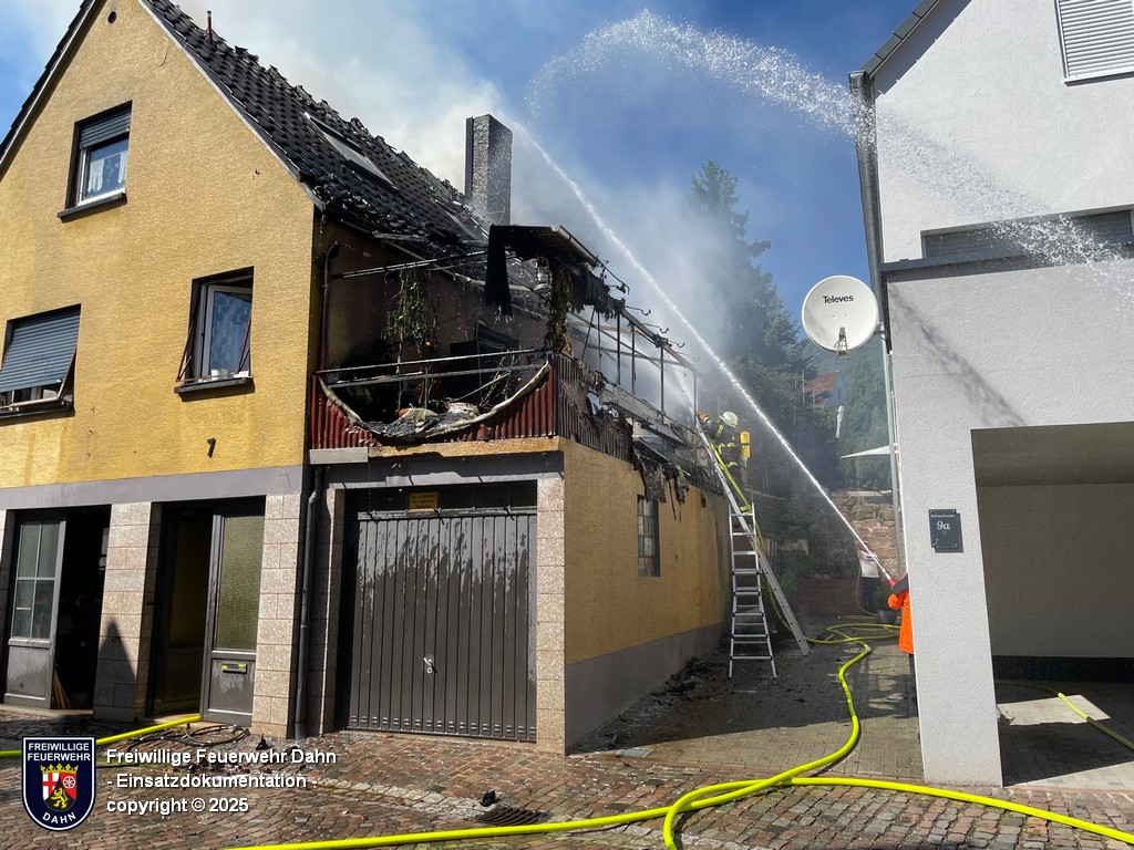 Am Mittag wurden mehrere Feuerwehren mit dem Stichwort „Wohnungsbrand Busenberg“ alarmiert. Bereits auf der Anfahrt der Einsatzkräfte wurde das Stichwort aufgrund der Vielzahl der Notrufe und der schnellen Brandausbreitung auf „Gebäudebrand“ erhöht. Die ersteintreffende Ortswehr stellte eine in Vollbrand stehende Terrasse fest, dessen Flammen sich bereits in das komplette Dachgeschoß des Einfamilienhauses ausgebreitet hatten. Unter schwerem Atemschutz und mithilfe von Steckleitern wurden die offenen Flammen mit mehreren Strahlrohren bekämpft, sodass die Brandausbreitung auf ein Nachbarhaus verhindert werden konnte. Zwei Bewohner, die mit einem Gartenschlauch erste Löschversuche unternahmen und im Gebäudeinneren Brandrauch einatmeten, wurden vom Rettungsdienst zur Untersuchung in ein Krankenhaus transportiert. Sie wurden am selben Abend entlassen und blieben unverletzt.